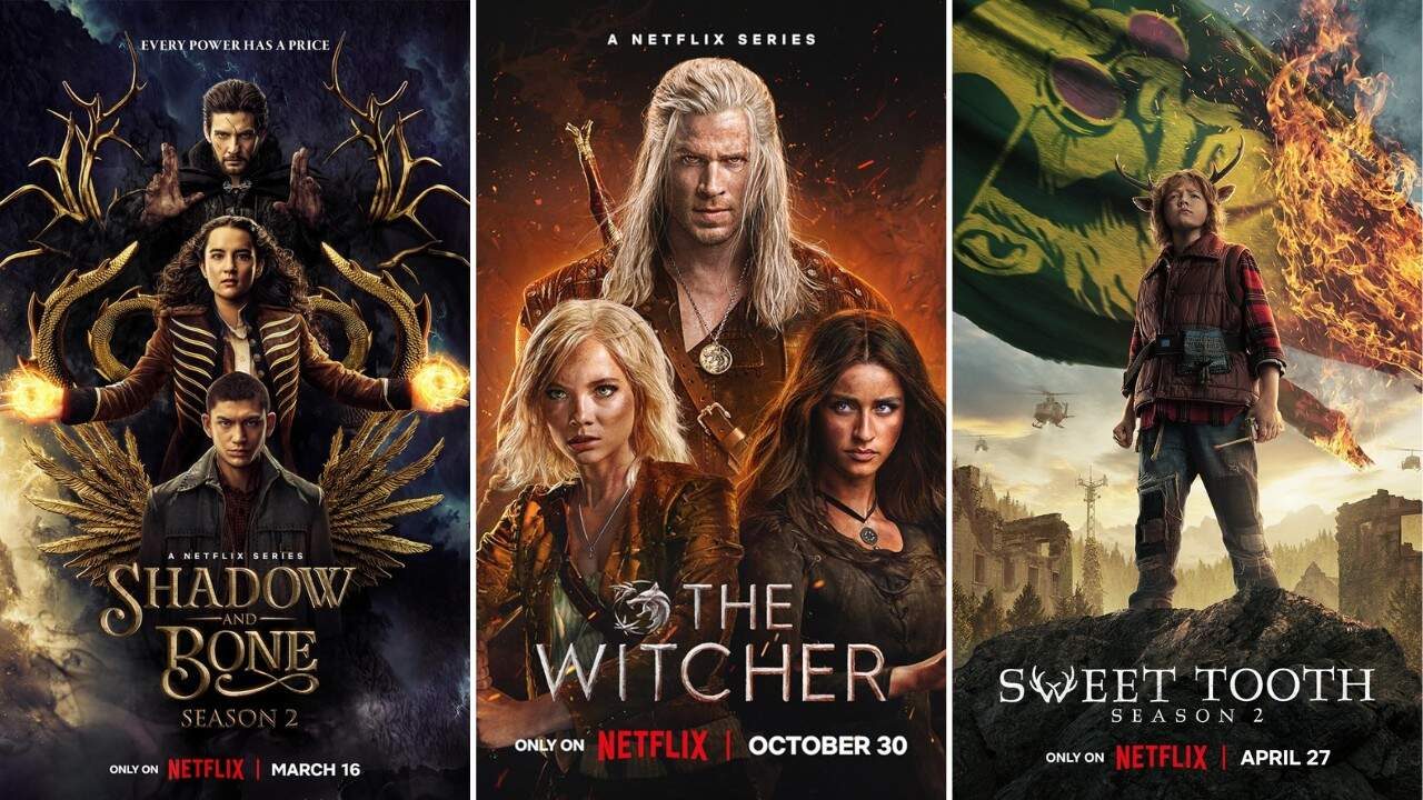 Collage of posters for Shadow and Bone, The Witcher, and Sweet Tooth showing top picks for the Best Fantasy Shows on Netflix for Instant Escape.